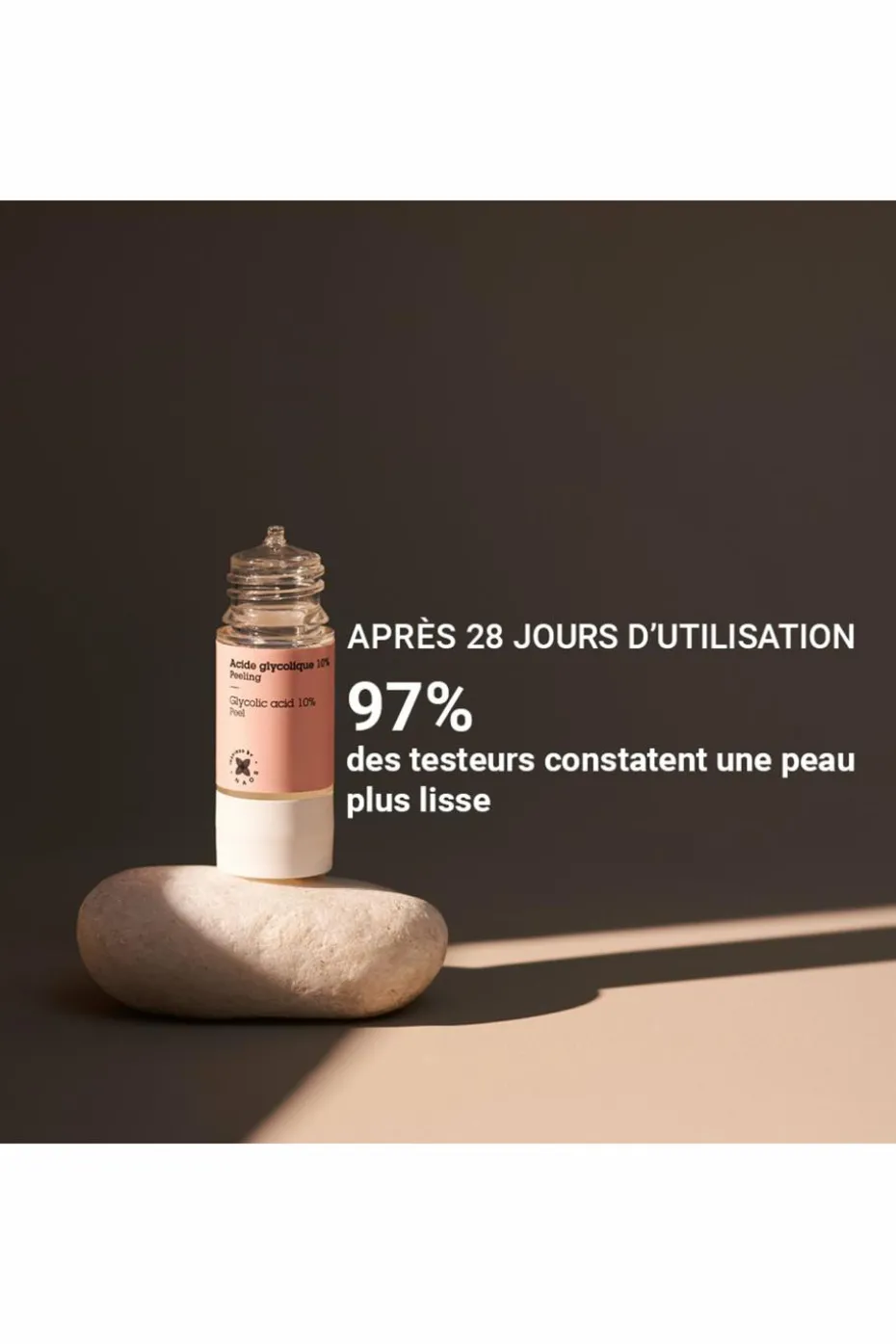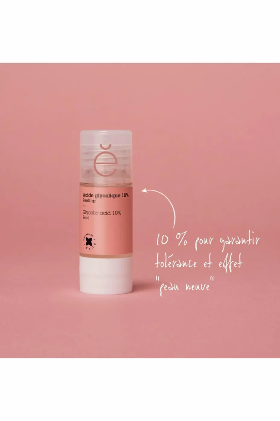 L’Actif Pur Acide glycolique 10%, puissant AHA, agit sur la perte d’éclat grâce à son action peeling.