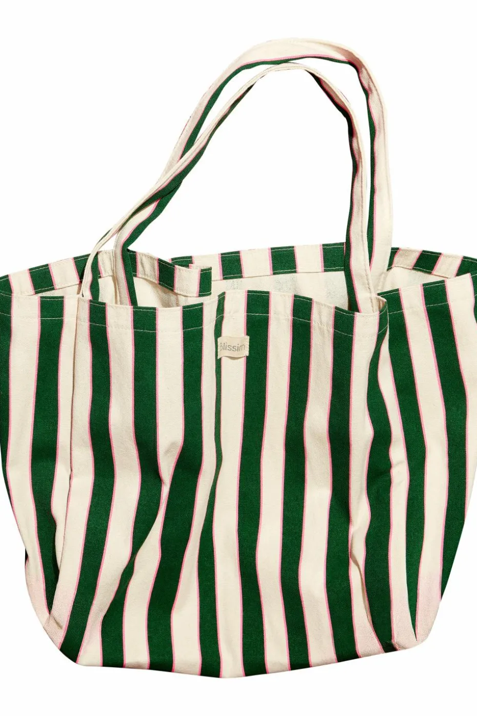 On vous présente le maxi sac qui ne vous quittera plus. On adore son imprimé rayé blanc & vert avec sa touche de rose !