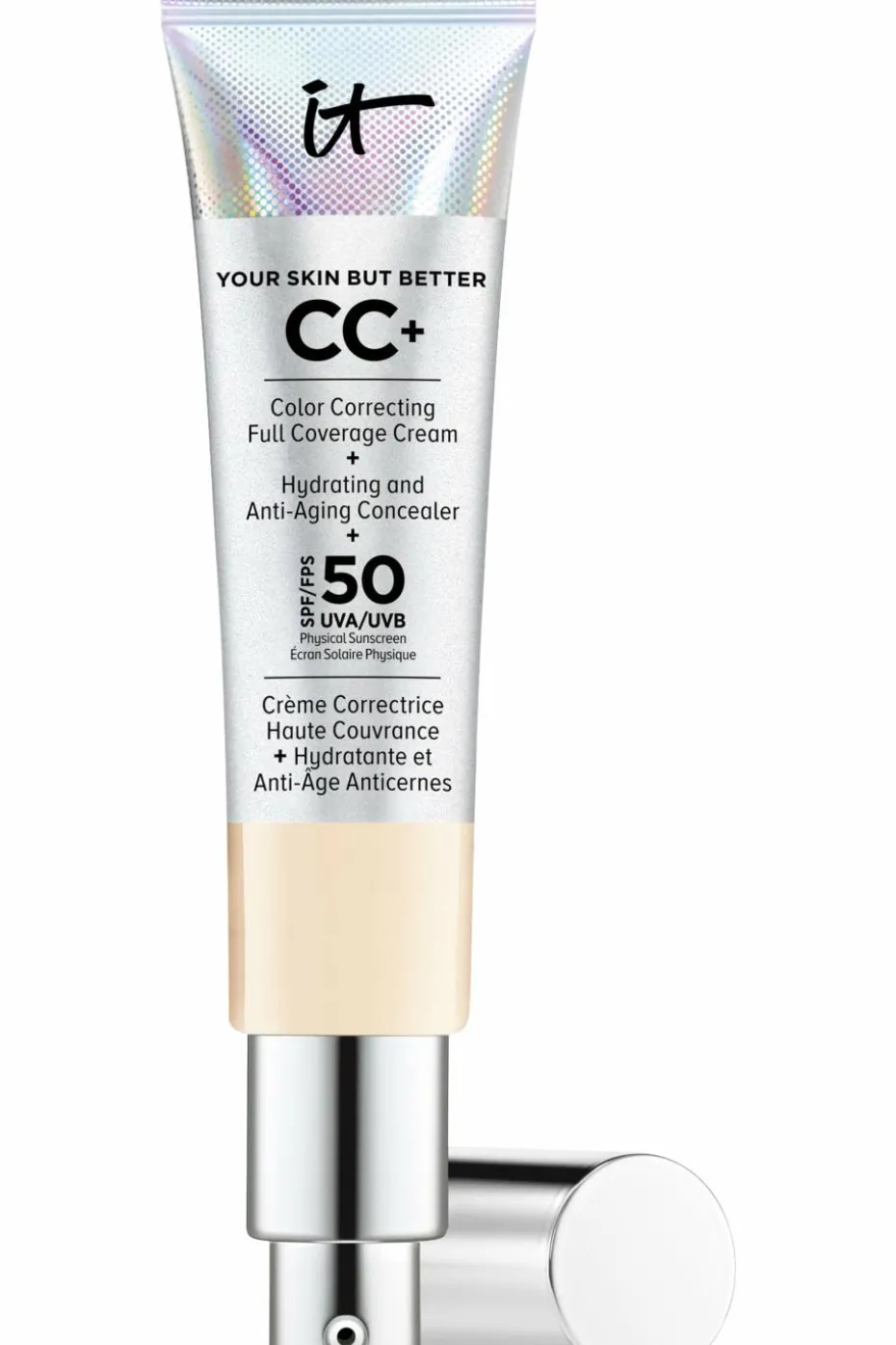 Développée avec des dermatologues et chirurgiens plasticiens, la CC+ Cream It Cosmetics est à la fois Crème Correctrice Haute Couvrance, Correcteur Hydratant et Protection SPF 50+ Anti-Âge !