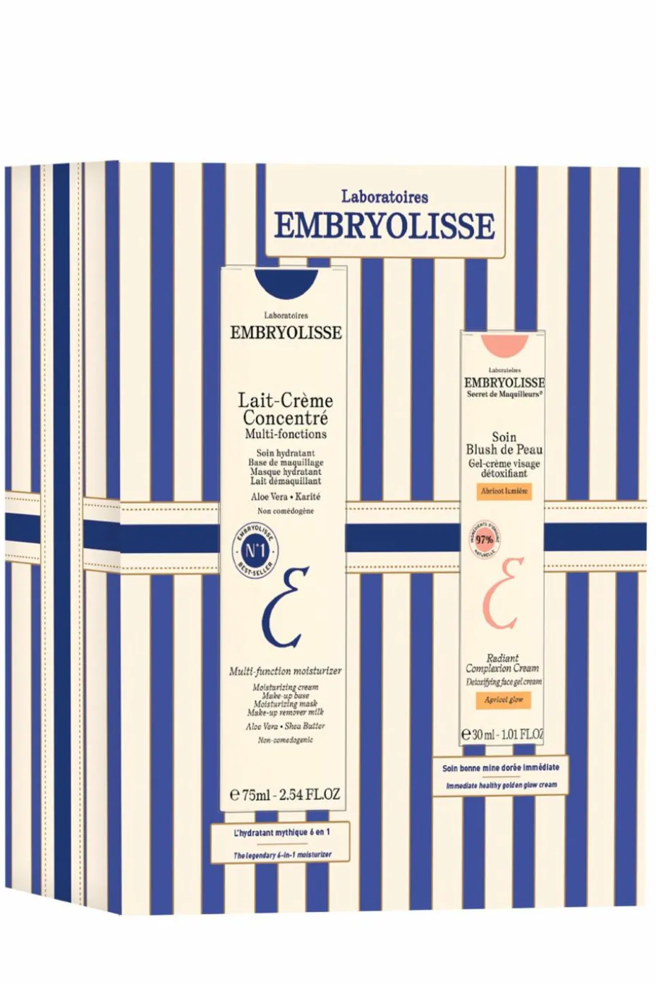 Le coffret de fin d’année Embryolisse est composé d’un Lait-Crème Concentré et d’un Soin Blush de Peau Abricot Lumière.