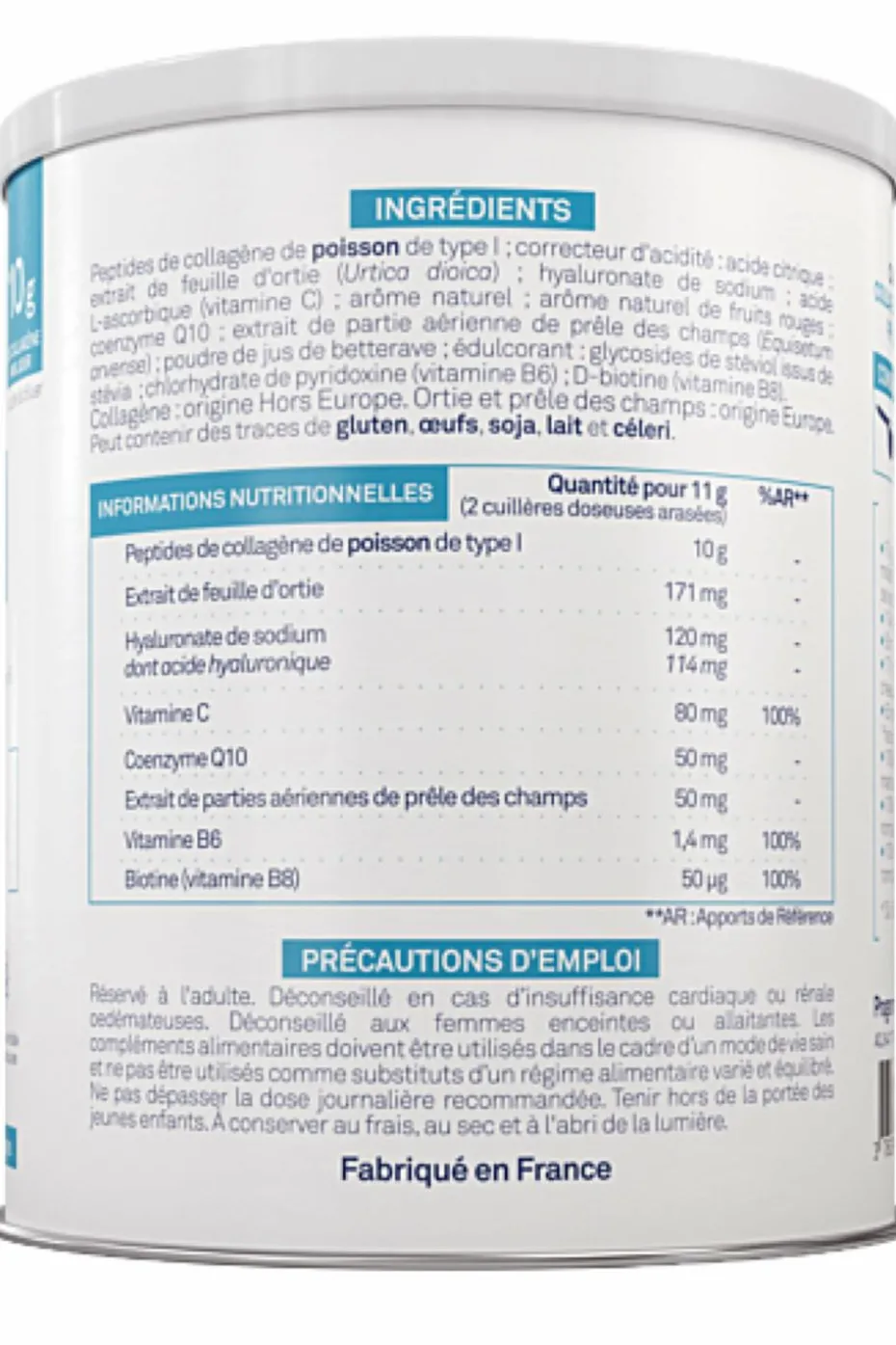 Un produit qui va agir sur les cheveux(1) (2) et la peau(3), apportant notamment 10g de peptides de collagène de type I !