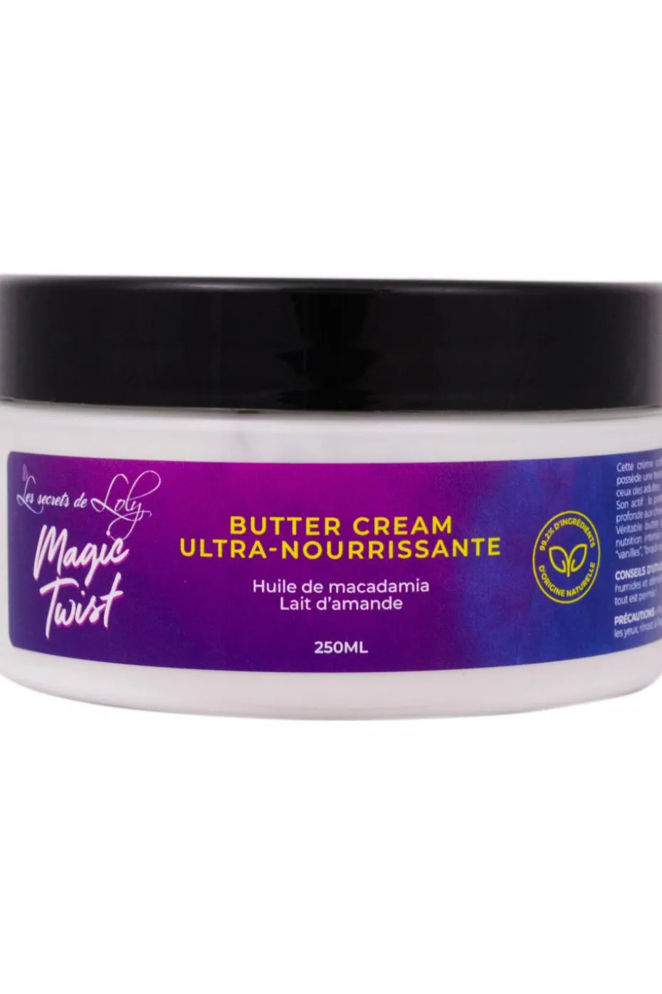 La crème Magic Twist est l’un des produits les plus nourrissants de Les Secrets de Loly. Cette crème à la texture d’un beurre va nourrir intensément vos cheveux. Avec son cocktail d’huiles de soja, de macadamia et d’amande douce la Magic Twist a un réel pouvoir nutritif adoucissant et ne laissera aucun fini gras. Effectuez vos vanilles, vos tresses, vos braids out ou votre twist out avec, elle vous aidera à obtenir une belle définition. Vous pouvez aussi l’utiliser pour nourrir sans réaliser de coiffure protectrice. Convient aux cheveux très frisés et crépus.