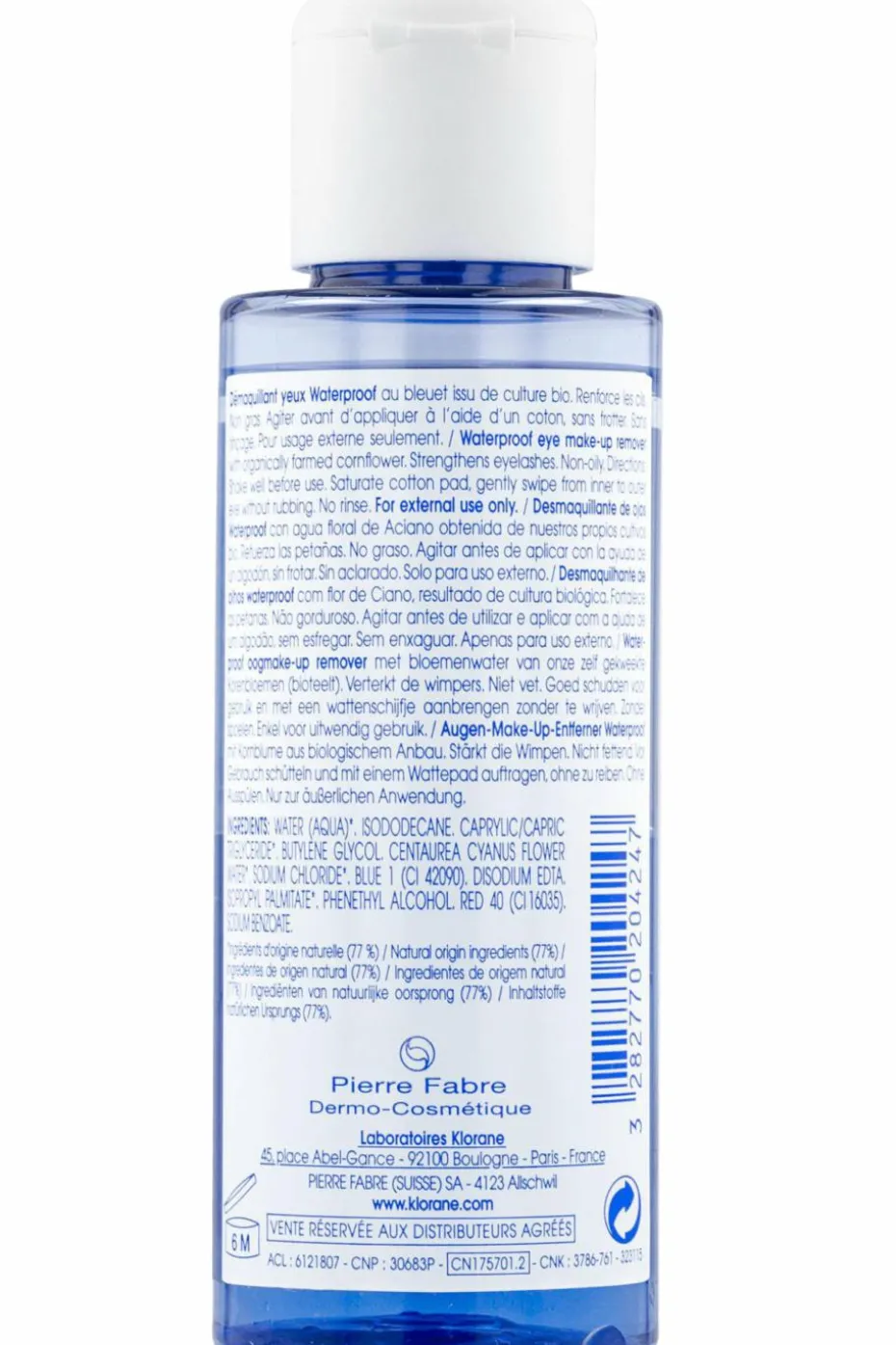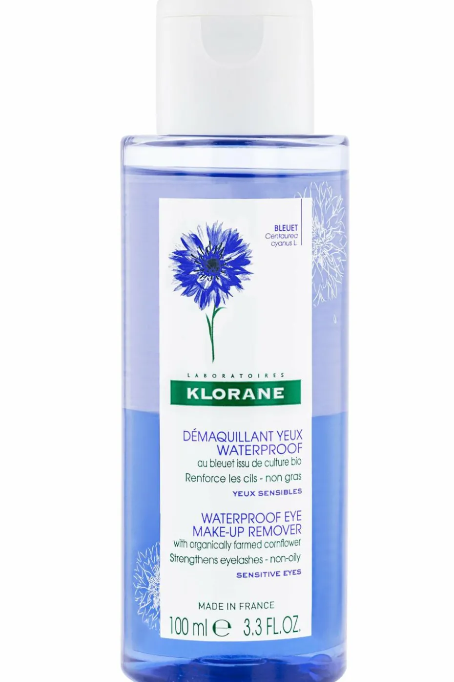 Le Démaquillant waterproof au Bleuet BIO de Klorane offre une double action : il élimine instantanément, parfaitement et sans frottement tout type de maquillage longue tenue, même waterproof, et renforce les cils sans laisser de film gras. Formulé pour respecter les yeux les plus sensibles, même porteurs de lentilles, ce démaquillant est enrichi en eau de Bleuet issu de culture biologique, aux propriétés apaisantes et décongestionnantes.