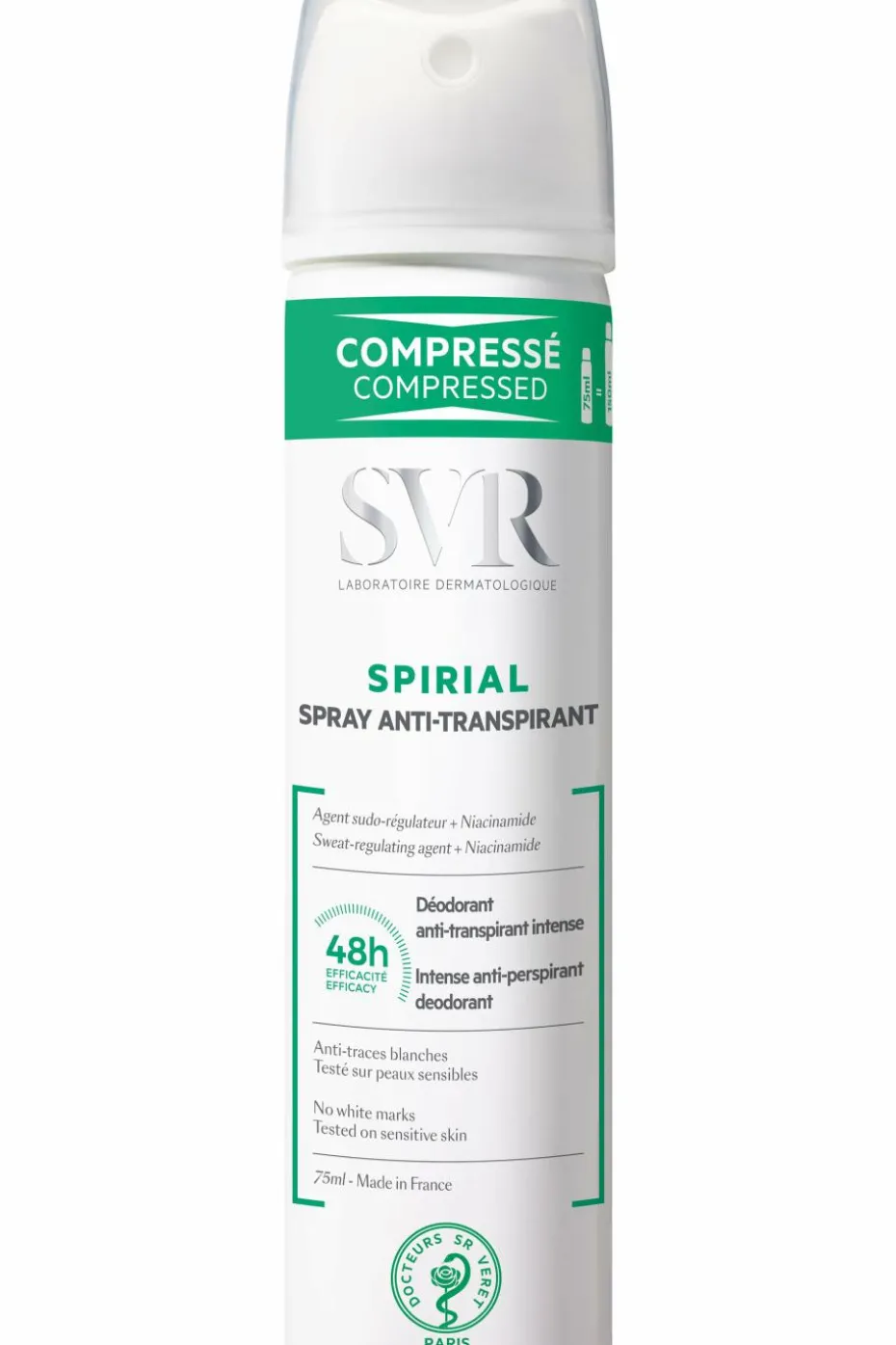 SPIRIAL Spray, déodorant, format compressé, à l’efficacité anti-transpirante intense 48h(1) même en situations extrêmes (sport, stress…). Formulé avec une haute concentration en agents sudo-régulateurs, il régule la transpiration, absorbe l’humidité et lutte contre les mauvaises odeurs dans la plus haute tolérance. Son fini sec immédiat laisse place à une peau douce et confortable sans laisser de traces blanches.
