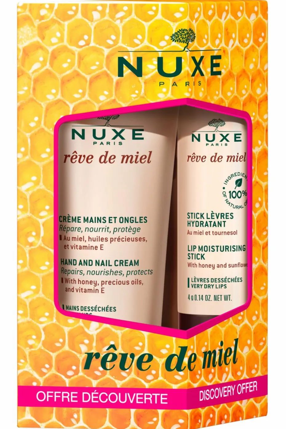 – Crème mains et ongles Rêve de Miel (30ml) : Cette crème hydratante mains nourrit, répare et protège les mains sèches. Sa texture soyeuse au doux parfum de miel enveloppe les mains de douceur sans effet gras.