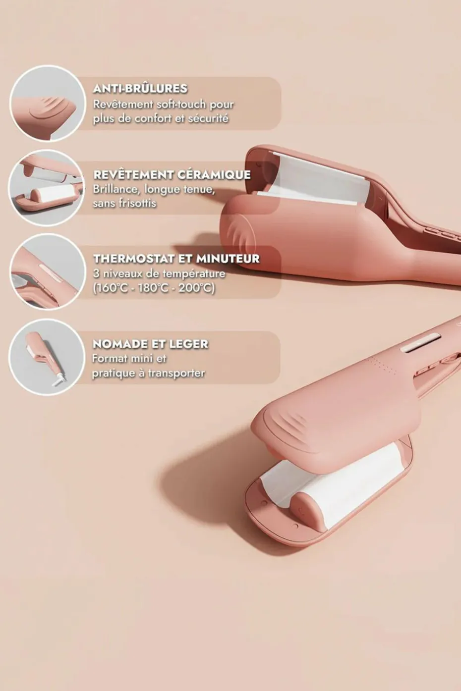 • Simple, léger et facile à transporter : Léger et nomade, le Party Waves s’emporte partout. Sa petite taille fait de lui un appareil très simple à utiliser et permet une prise en main optimale et un coiffage très agréable. Le cadenas de sécurité permet de refermer le clapet du waver après chaque utilisation. Rangez-le facilement tout en protégeant ses barils de la poussière et des rayures.
