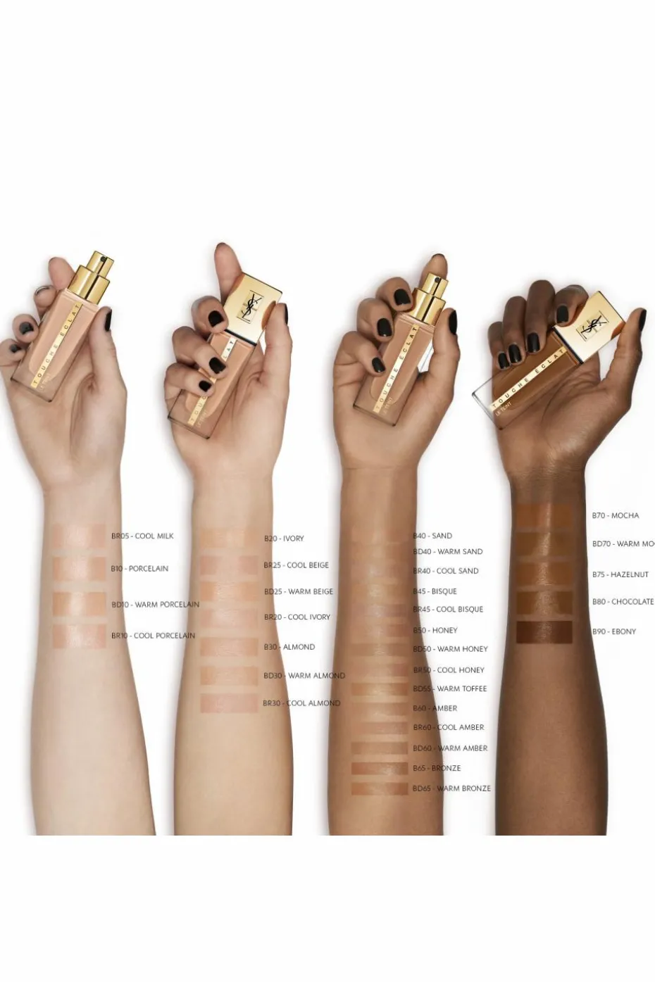 • Peaux claires à moyennes : Beige : B10, B20, B30 – Beige Dorée : BD10, BD25, BD30 – Beige Rosée : BR05, BR10, BR20, BR25, BR30