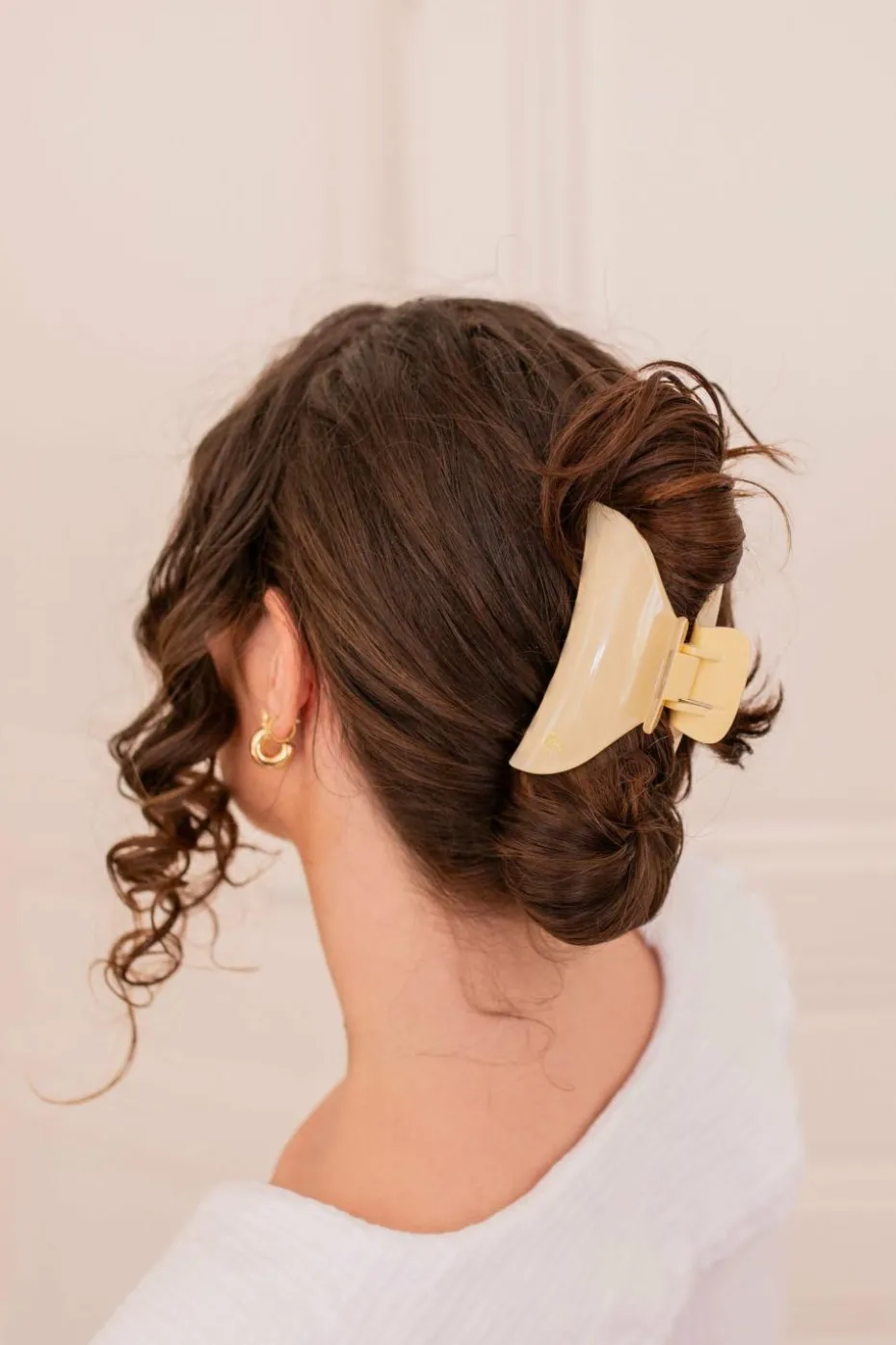 Avec son élégant jeu de transparence, la grande pince opaline ivoire sublime toutes les natures et toutes les couleurs de cheveux.