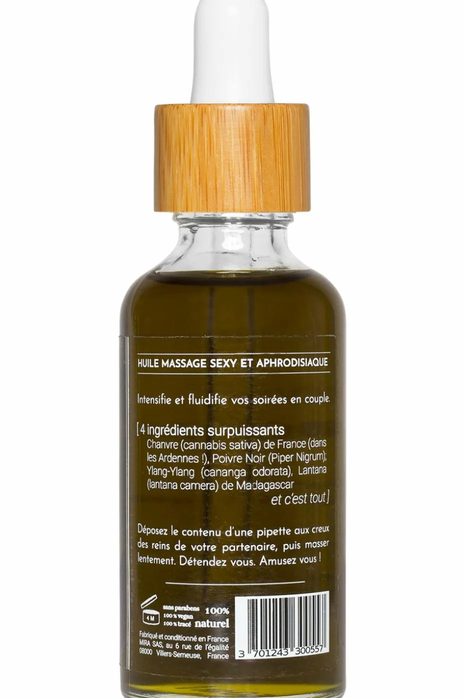 4 ingrédients naturels, les plus efficaces, pour votre huile de massage aphrodisiaque. L’huile de chanvre, douce huile naturelle, nourrissante ; les huiles essentielles de poivre noir, d’ylang ylang et de lantana venues de Madagascar pour pimenter et réveiller vos sens.