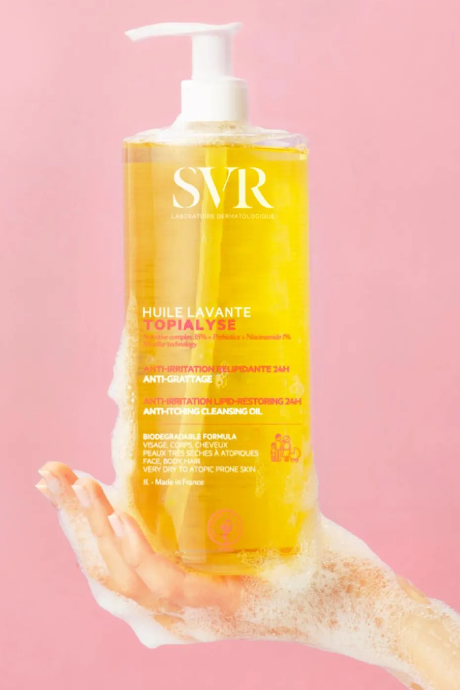 TOPIALYSE Huile Lavante est un véritable soin lavant qui nourrit intensément la peau et préserve le film hydrolipidique tout en réduisant les sensations de tiraillements et de grattage.