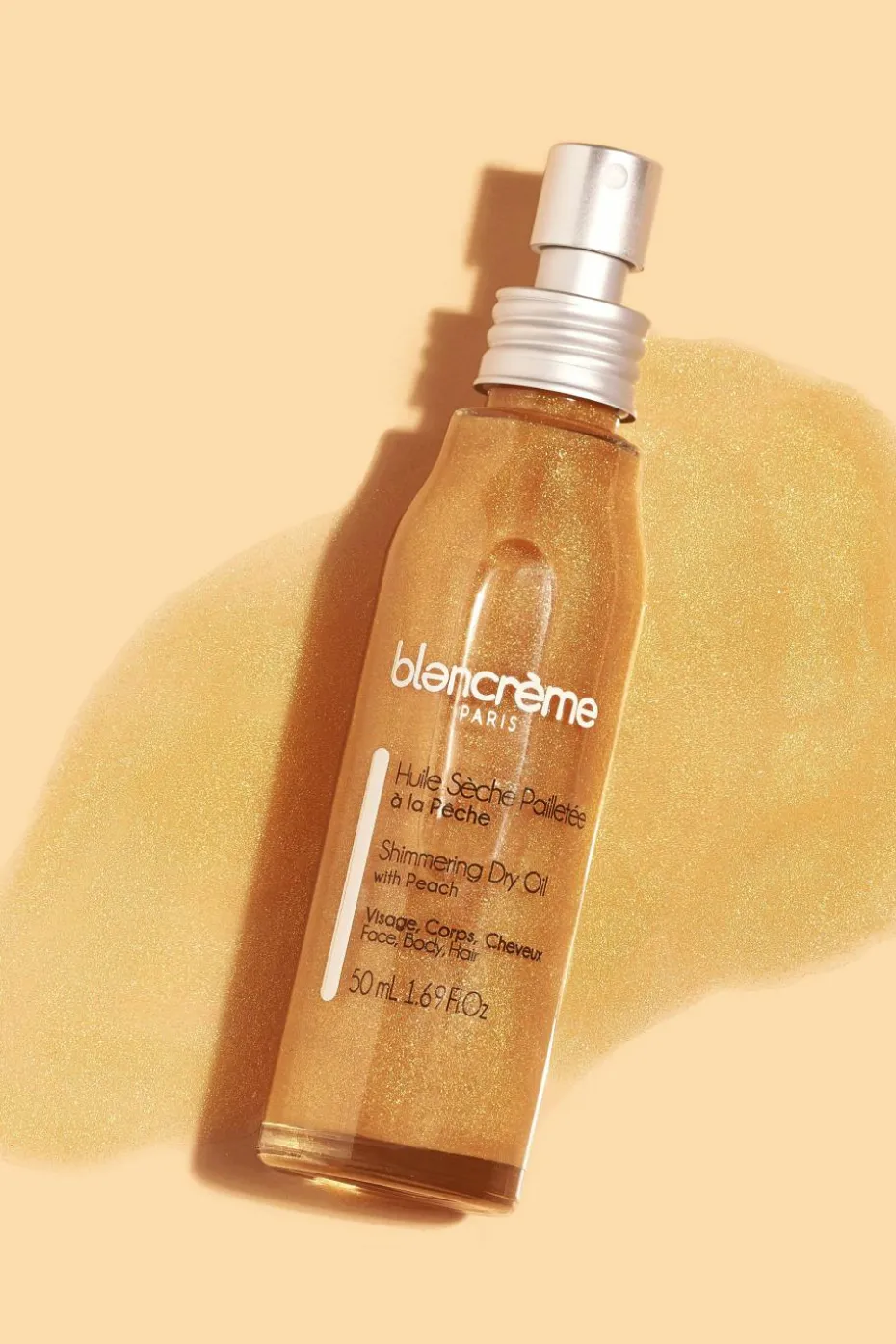 Notre huile sèche pailletée la magnifiera grâce à l’association des trois huiles nourrissantes d’amande douce, de noyau d’abricot et de jojoba. Sa formule est enrichie en extrait de pêche adoucissant. Sa texture non-grasse pénètre rapidement et laisse votre peau douce, nourrie et délicatement irisée. Cerise sur le gâteau, son parfum pêche ensoleillé est à tomber !