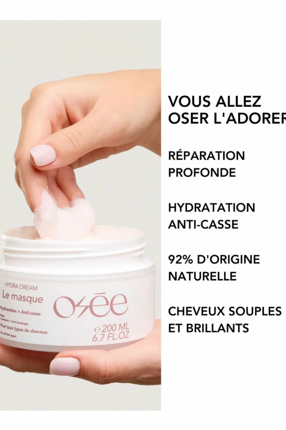 Hydratation & anti-casse – Parce qu’un cheveu sec est un cheveu cassant et terne, ce masque (riche et gourmand) infuse, nourrit et transforme le cheveu dès la première utilisation. Notre formule star : Oser la transformation.