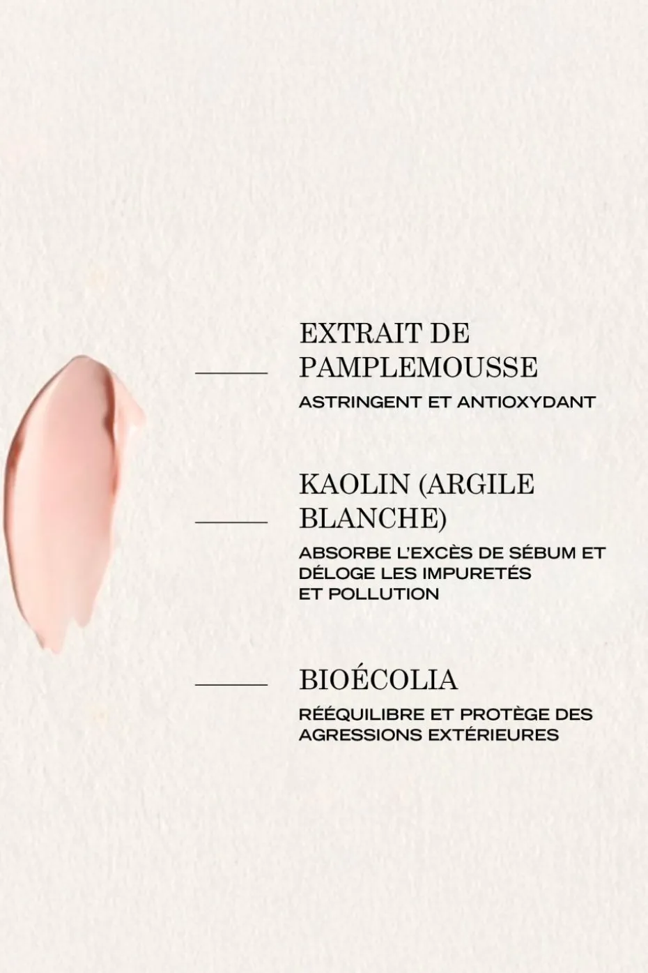 AQUA (WATER) ● KAOLIN ● CAPRYLIC/CAPRIC TRIGLYCERIDE ● GLYCERYL STEARATE ● PEG-100 STEARATE ● PROPYLENE GLYCOL ● CI 77891 (TITANIUM DIOXIDE) ● PENTYLENE GLYCOL ● HECTORITE ● PALMITIC ACID ● STEARIC ACID ● CITRUS PARADISI (GRAPEFRUIT) FRUIT EXTRACT ● MALACHITE EXTRACT ● SMITHSONITE EXTRACT ● DECYL GLUCOSIDE ● PARFUM (FRAGRANCE) ● ALLANTOIN ● CHLORPHENESIN ● DISODIUM EDTA ● GLYCERIN ● LIMONENE ● CITRONELLOL ● GERANIOL ● ALPHA-GLUCAN OLIGOSACCHARIDE ● CI 14700 (RED 4)