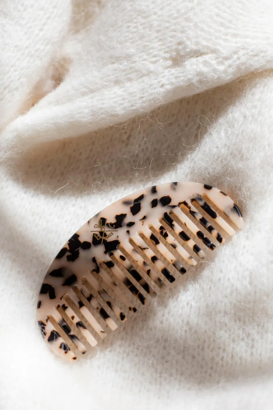 Peigne en finition écaille, idéal pour tous les types de cheveux. Il démêle en douceur grâce à ses dents arrondies.
