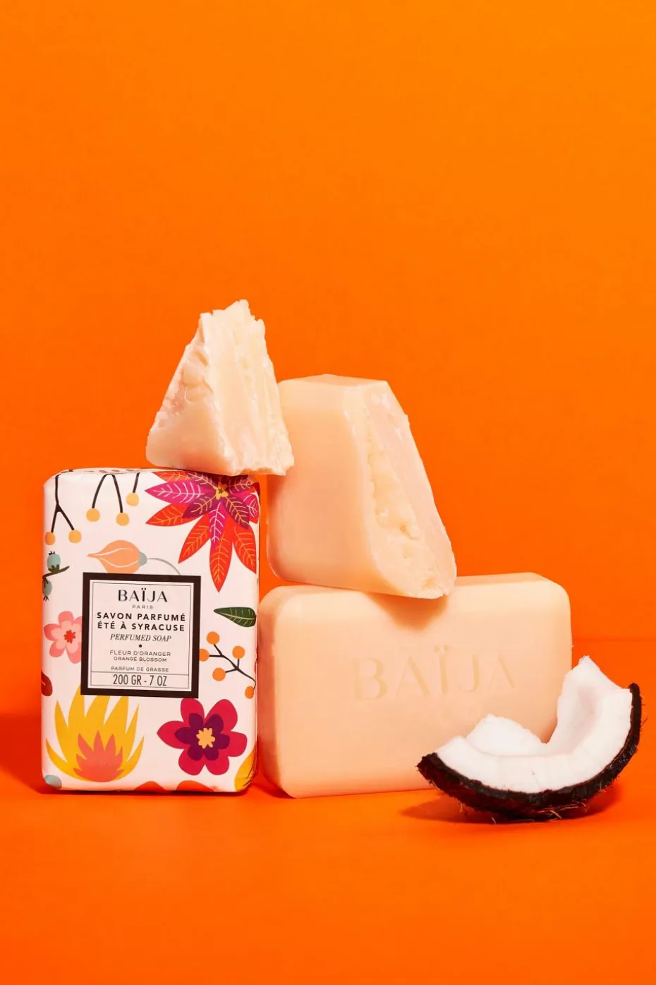Le savon solide parfumé Été à Syracuse de la marque Baïja est élaboré en France à partir de Beurre de Karité et d’Huile végétale certifiée RSPO, sans EDTA ni colorant.