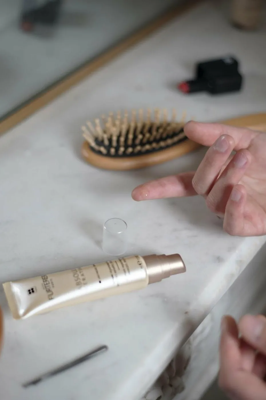 Sur cheveux secs ou essorés, déposez 2 à 3 perles de produit sur le bout des doigts, chauffez et appliquez sur les pointes.