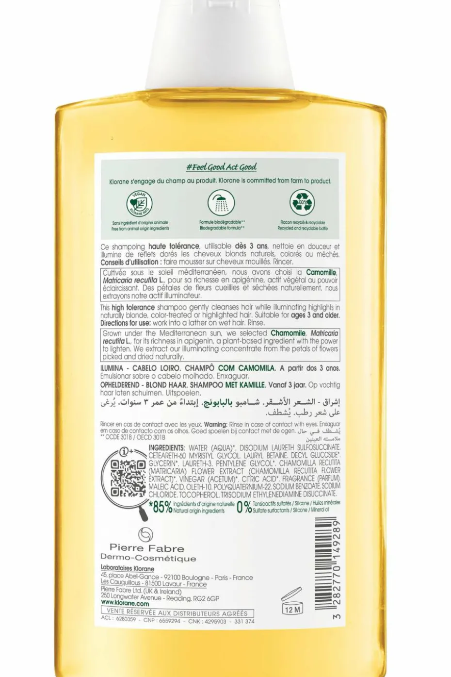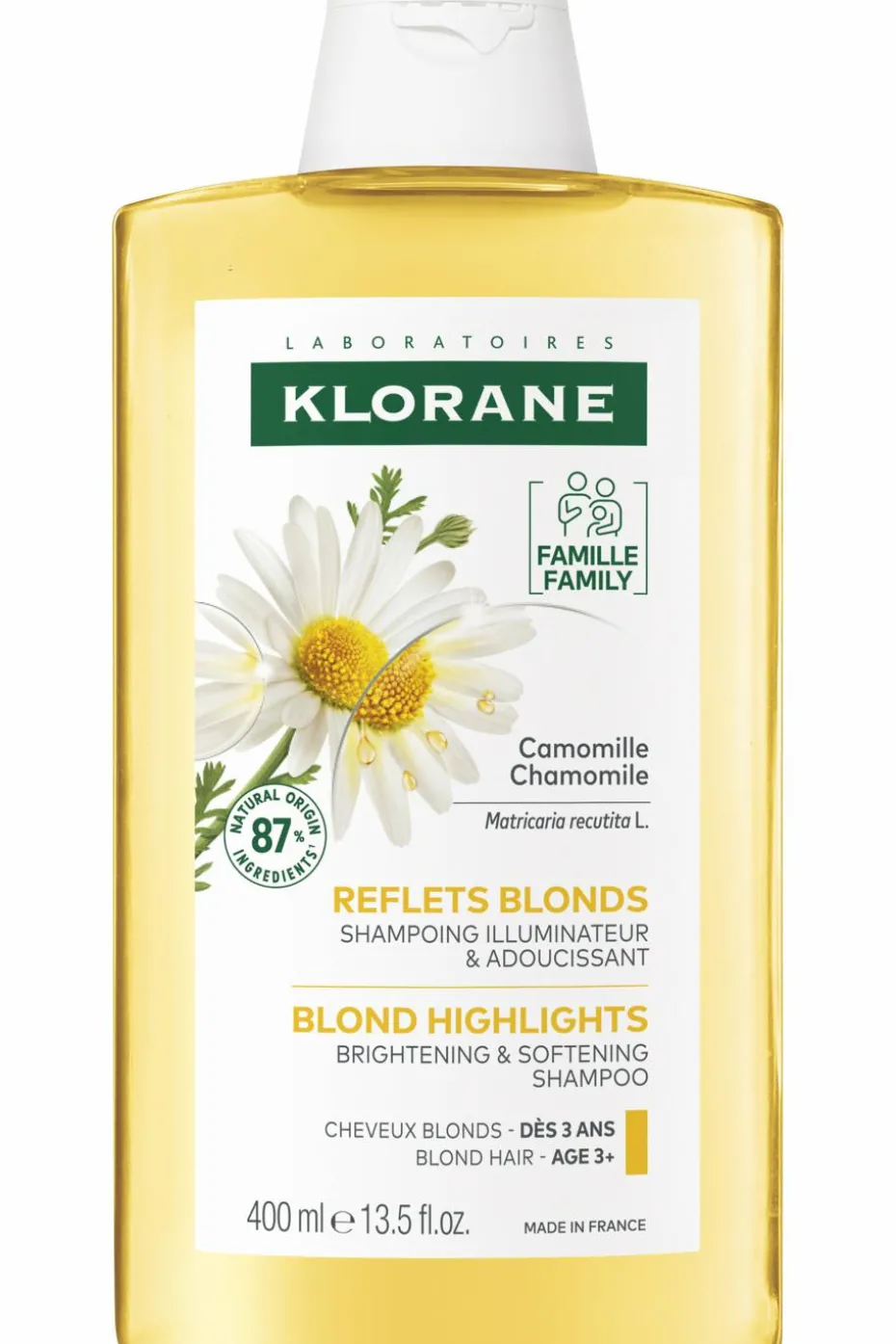 Utilisable dès 3 ans, le Shampoing illuminateur à la Camomille de Klorane nettoie en douceur les cheveux et apporte des reflets dorés naturels aux cheveux blonds naturels, méchés ou colorés. La Camomille, riche en pigments jaunes naturels, est traditionnellement utilisée pour éclairer délicatement toutes les nuances de blonds. La chevelure s’éclaircit subtilement et s’illumine de reflets dorés pour des cheveux doux, propres, légers et brillants de lumière.