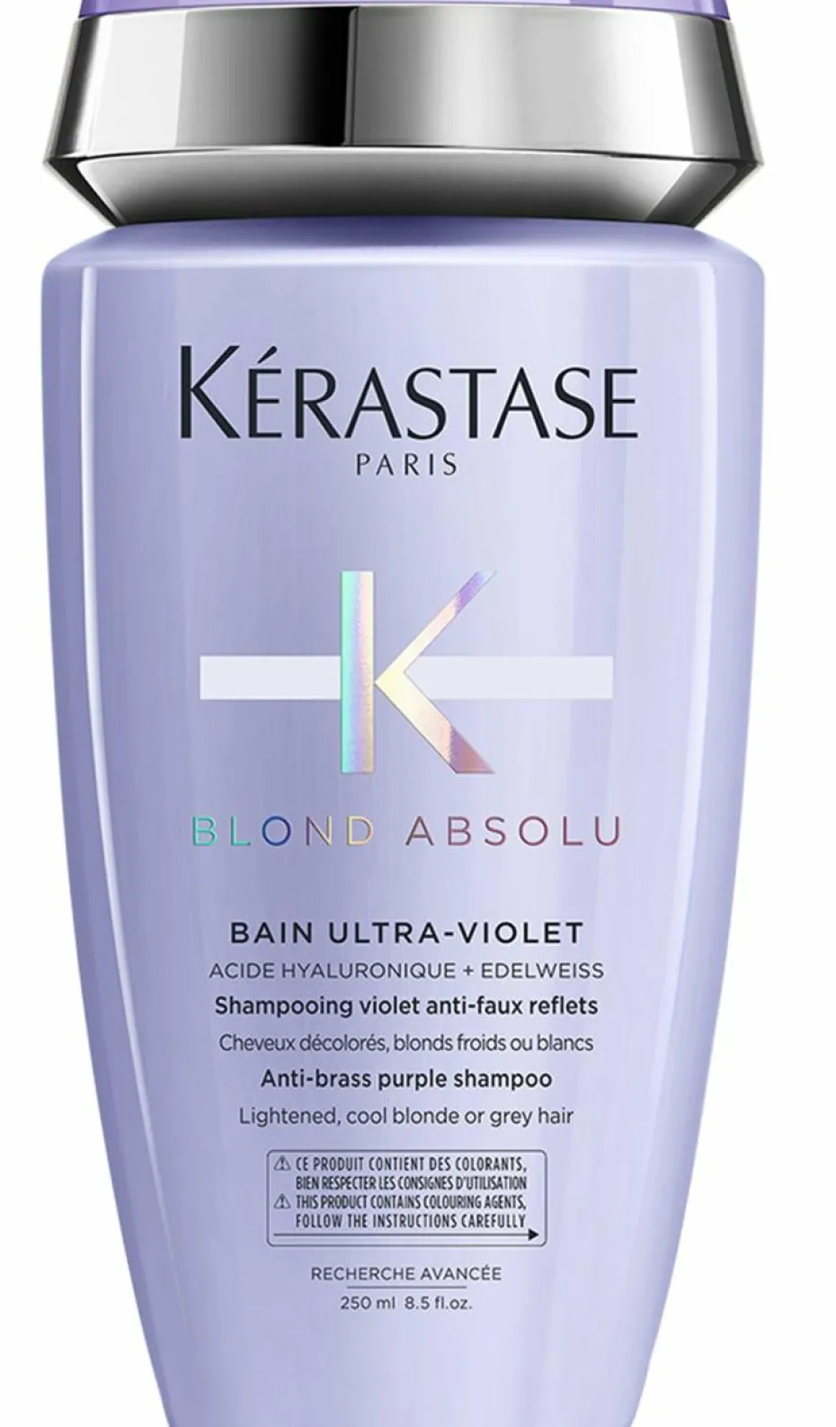 Le Bain Ultra-Violet est un shampooing anti faux-reflets spécialement formulés pour les cheveux méchés ou décolorés. Il est développé avec la Technologie d’Acide Hyaluronique et de fleur d’Edelweiss.