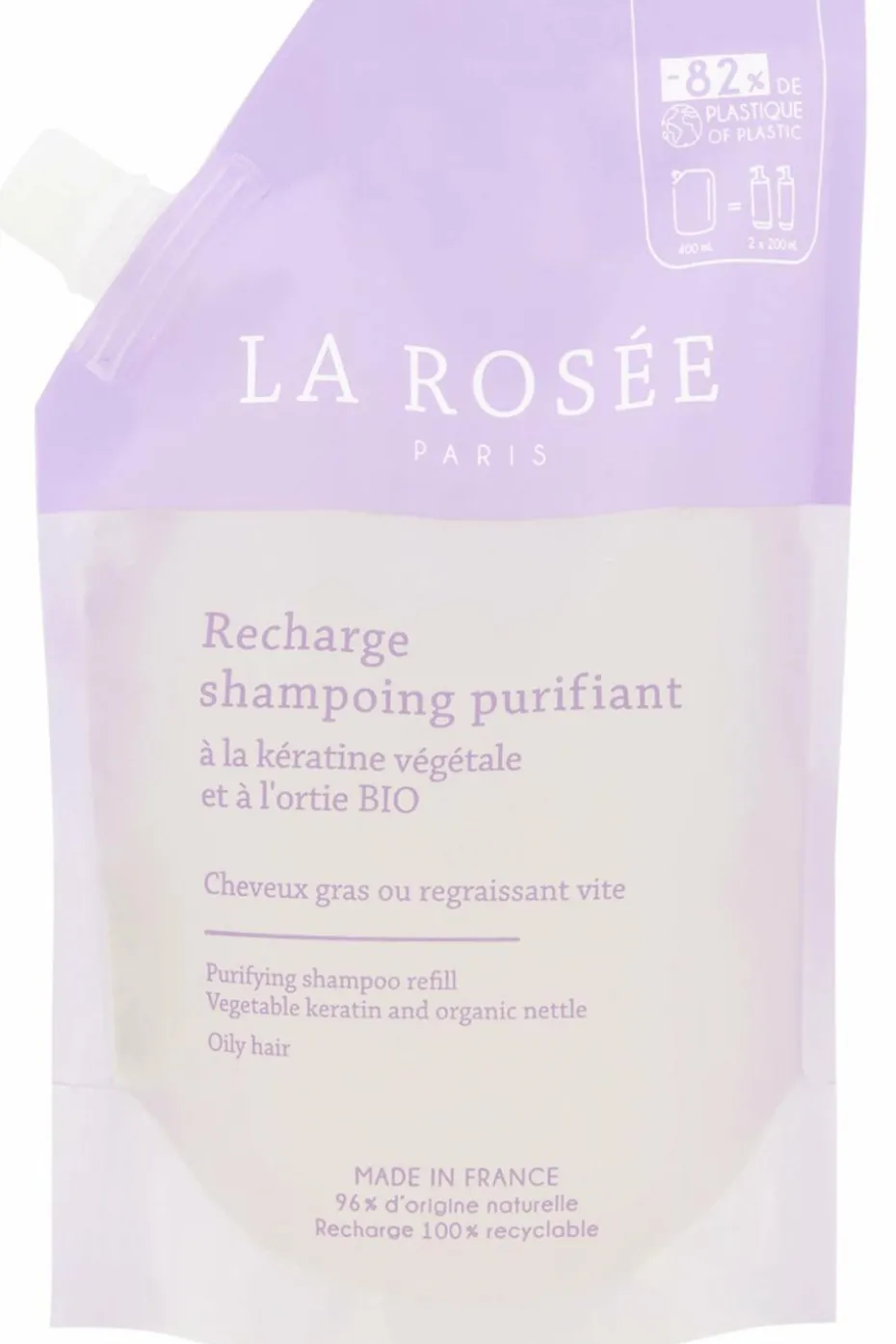 Les recharges de shampoings de 400 mL permettent de remplir deux fois votre flacon en verre de 200 mL. Ce geste permet d’économiser 82 % de plastique* !