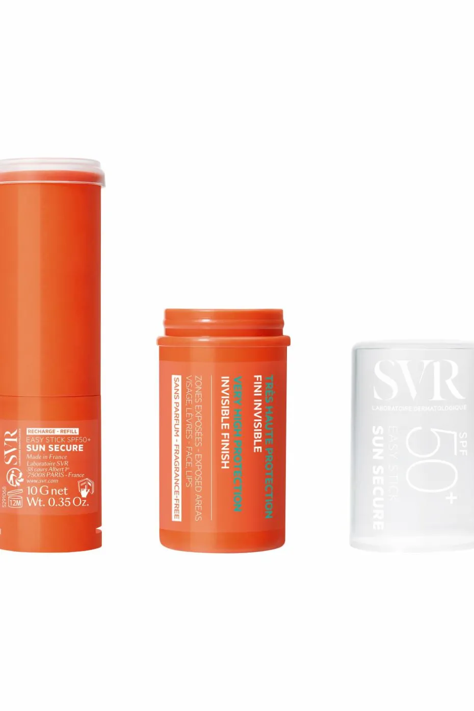 Une formule gel stick non collante au fini invisible sur la peau dans un format nomade pratique qui permet de cibler toutes les zones exposées : Sun Secure Easy Stick SPF50+ très haute protection dermatologique large spectre dans un nouveau format à emporter partout. Le 1er stick solaire rechargeable1, pour 52% de plastique en moins 2.