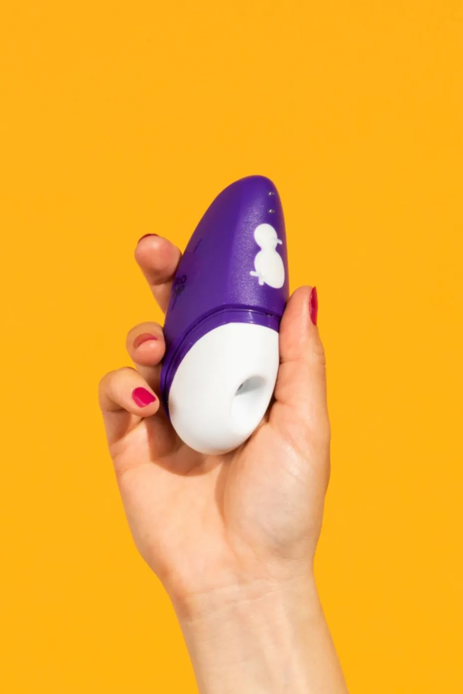 Retirez la housse de protection et maintenez le bouton (+) enfoncé pendant 2 secondes pour allumer ROMP Free. Trouvez votre clito. Montrez-lui le monde ! Appliquez un lubrifiant à base d’eau sur la tête de stimulation et sur votre clitoris.