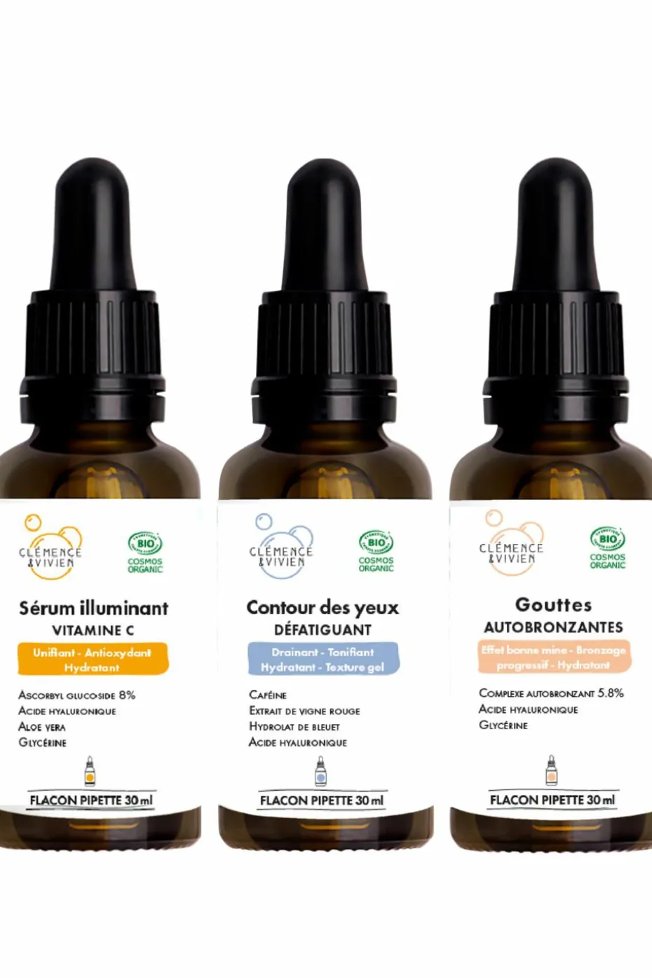 Un trio avec le Sérum illuminant à la vitamine C, le Contour des yeux défatiguant et les Gouttes autobronzantes hâle léger.