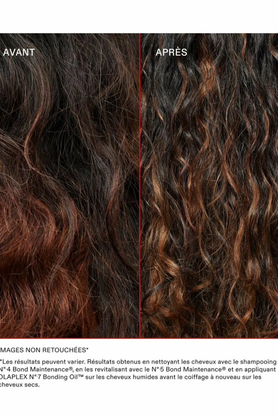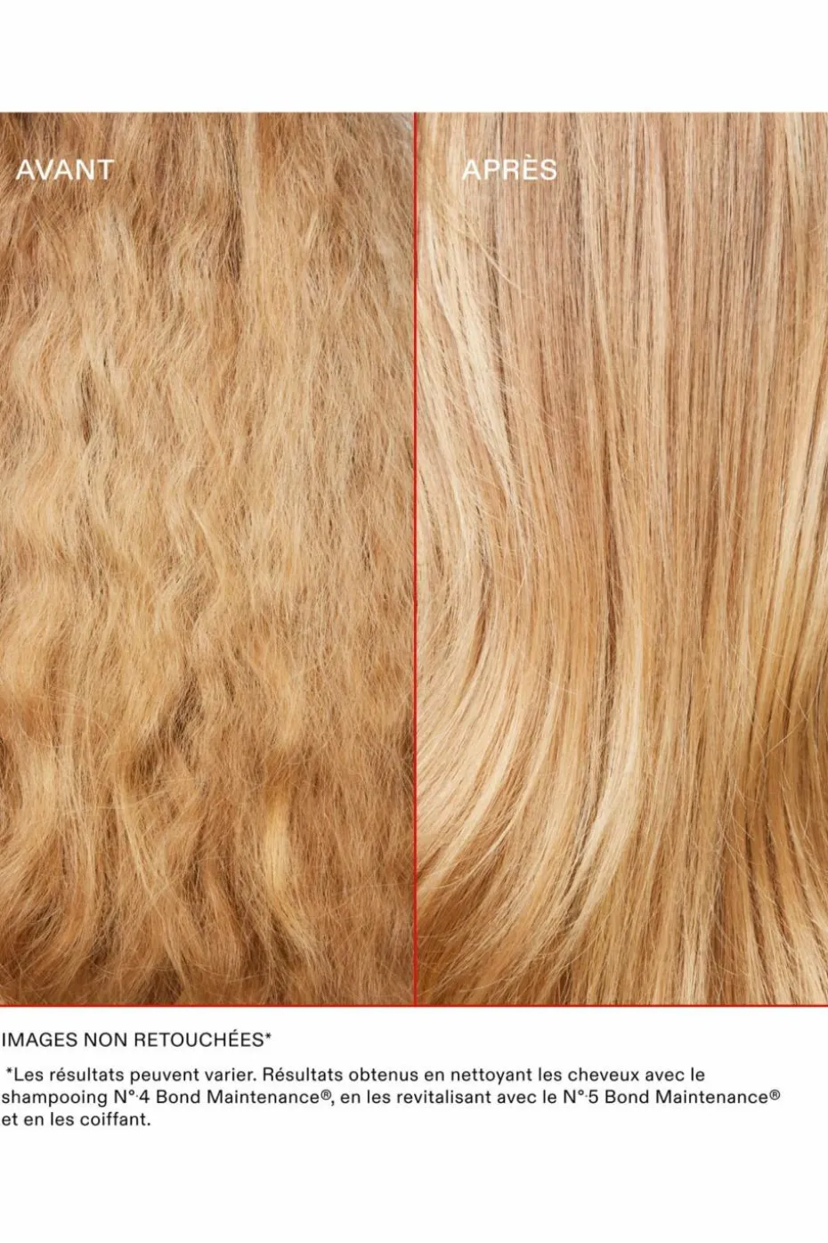L’Après-Shampoing Bond Maintenance No.5: Water/Aqua/Eau, Cetearyl Alcohol (alcool cétéarylique), PPG-3 Benzyl Ether Myristate, Caprylic/Capric Triglyceride (triglycéride caprylique), Cetyl Alcohol (alcool cétylique), Octyldodecyl Ricinoleate, Quaternium-91, Cetrimonium Chloride (chlorure de cétrimonium), Divinyldimethicone/Dimethicone Copolymer (copolymère divinyldiméthicone/diméthicone), Behentrimonium Chloride (chlorure de behentrimonium), Glycerin (glycérine), Cetyl Esters, Isododecane (isododécane), Bis-Aminopropyl Diglycol Dimaleate (dimaléate de bis-aminopropyl diglycol), Panthenol (panthénol), Phospholipids (phospholipides), Dimethicone PEG-7 Isostearate, Hydroxypropyl Guar (guar hydroxypropylique), Glycine Soja (Soybean) Oil (huile de soja), PEG-7 Amodimethicone, Amodimethicone, Disodium EDTA (EDTA disodique), C12-13 Alketh-23, C12-13 Alketh-3, Camellia Sinensis Seed Oil (huile de graine de thé vert), PEG-45M, Polysilicone-15, C11-15 Alketh-7, Sodium Polyaspartate, Crambe Abyssinica Seed Oil (huile d’Abyssinie), Persea Gratissima (Avocado) Oil (huile d’avocat), Vitis Vinifera (Grape) Seed Oil (huile de pépins de raisin), Hydroxypropyl Cyclodextrin (hydroxypropylcyclodextrine), Laureth-9, Citric Acid (acide citrique), Trideceth-12, Butylene Glycol, Ahnfeltiopsis Concinna Extract (extrait d’algue rouge), Silica Dimethyl Silylate, Acetic Acid (acide acétique), Silica, Pentaerythrityl Tetra-Di-T-Butyl Hydroxyhydrocinnamate (tétra-di-tert-butyl hydroxycinnamate de pentaérythritol), Propylene Glycol (propylène Glycol), Sodium Acetate (acétate de sodium), PEG-4 Dilaurate, PEG-4 Laurate, BHT, Hydrolyzed Hyaluronic Acid (acide hyaluronique hydrolysé), PEG-4, Pseudozyma Epicola/Argania Spinosa Kernel Oil Ferment Filtrate (huile d’argan), Pseudozyma Epicola/Camellia Sinensis Seed Oil Ferment Extract Filtrate (huile de théier), Tocopheryl Linoleate/Oleate, Helianthus Annuus (Sunflower) Seed Oil (huile de graines de tournesol), Quaternium-95, Propanediol, Helianthus Annuus (Sunflower) Seed Extract (extrait de graines de tournesol), PEG-8, Punica Granatum Extract (extrait de grenade), Morinda Citrifolia Fruit Extract (extrait de noni), Euterpe Oleracea Fruit Extract (huile végétale d’açaï), PEG-8/SMDI Copolymer (copolymère PEG-8/SMDI), Palmitoyl Myristyl Serinate, Sodium Polyacrylate (polyacrylate de sodium), Tocopherol (tocophérol), Biotin (biotine), Phenoxyethanol (phénoxyéthanol), Iodopropynyl Butylcarbamate, Chlorphenesin (chlorphénésine), Sodium Dehydroacetate, Sodium Benzoate (benzoate de sodium), Potassium Sorbate (sorbate de potassium), Fragrance (parfum), Hexyl Cinnamal, Limonene (limonène), Citral