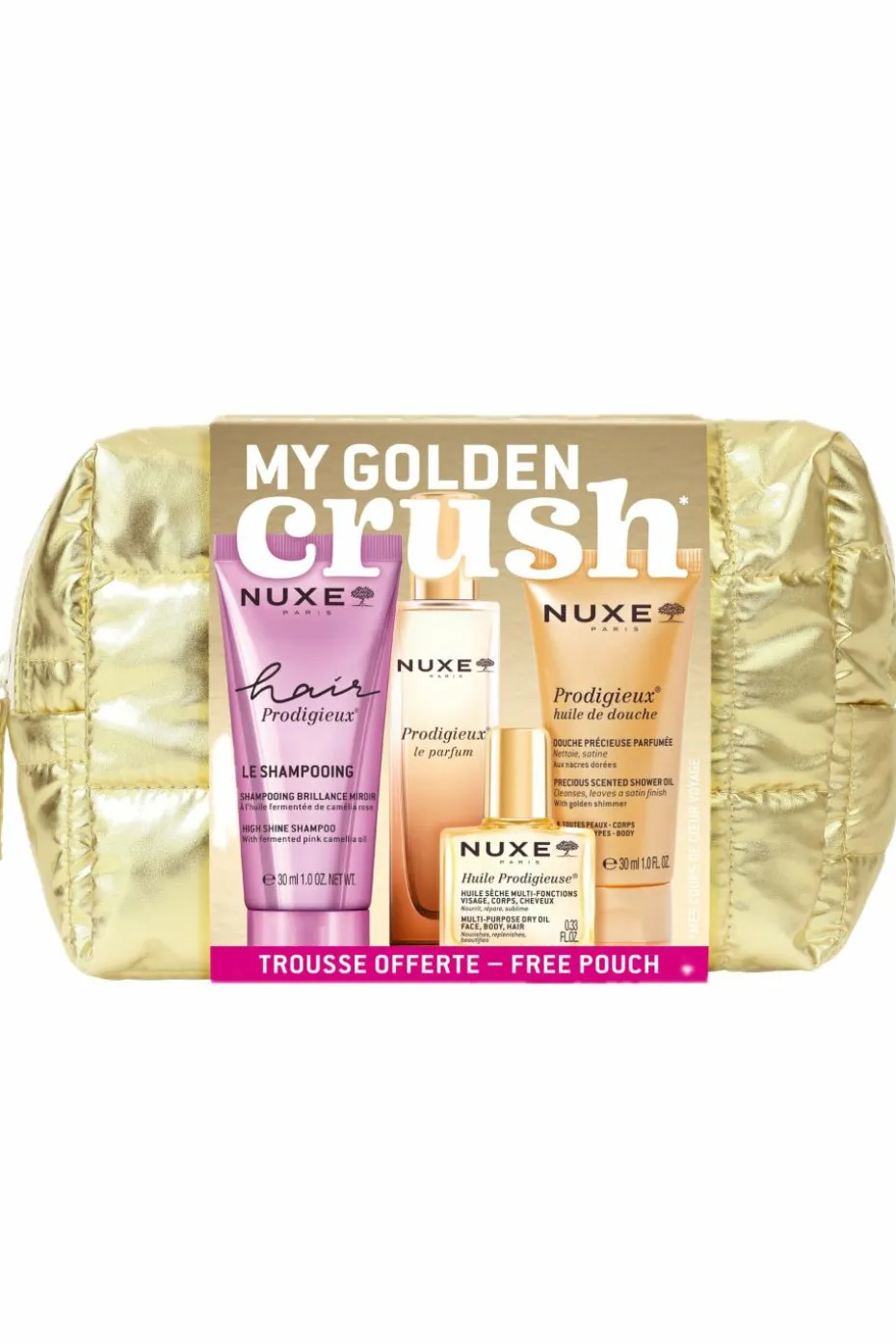 – L’Huile de douche Prodigieux® (30 ml-format voyage):Une huile de douche, aux nacres dorées, ultra-sensorielle qui nettoie en douceur, satine et parfume pour un véritable moment de plaisir.