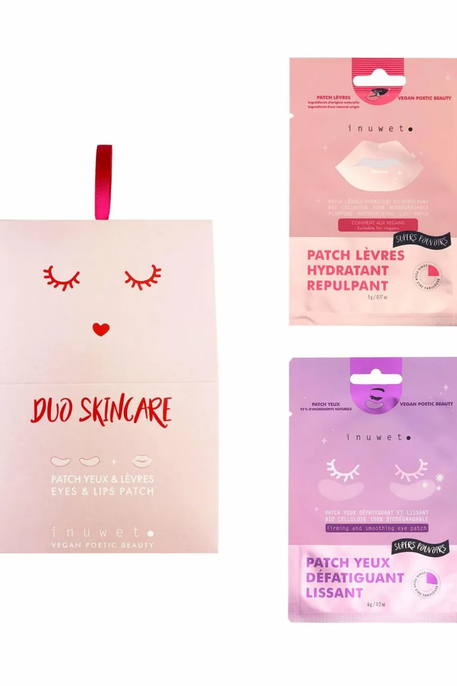 Patchs lèvres: AQUA, BUTYLENE GLYCOL, GLYCERIN, TREHALOSE, HYDROXYACETOPHENONE, 1,2-HEXANEDIOL, XANTHAN GUM, NIACINAMIDE, AMMONIUM ACRYLOYLDIMETHYLTAURATE/VP COPOLYMER, CAULERPA LENTILLIFERA EXTRACT, CHENOPODIUM FORMOSANUM SEED EXTRACT, FRAGRANCE, SODIUM HYALURONATE