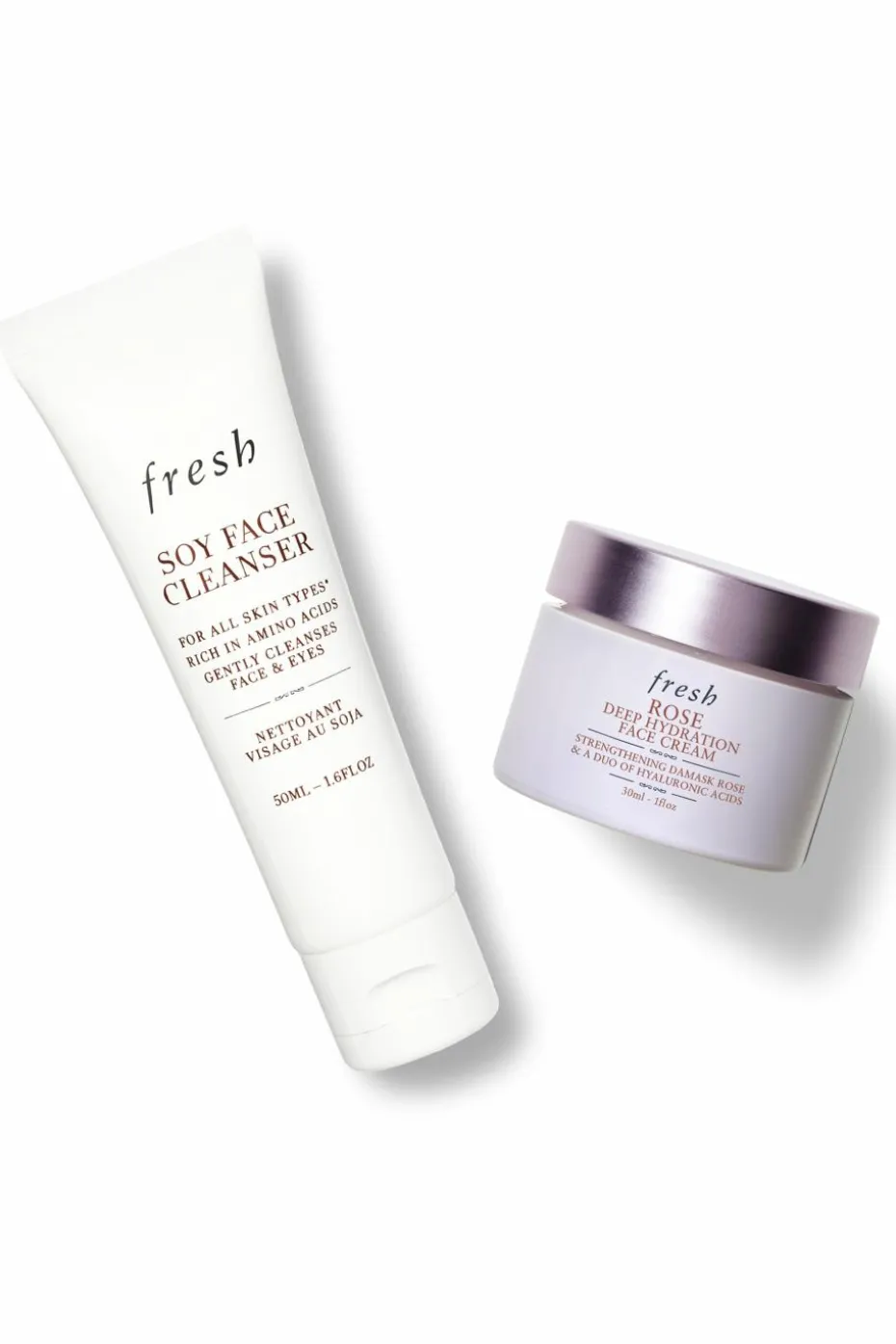 Revenez aux classiques avec ce rituel de voyage en deux étapes: Soy Face Cleanser (50 ml Format voyage) et Rose Face Cream (30 ml Format voyage).