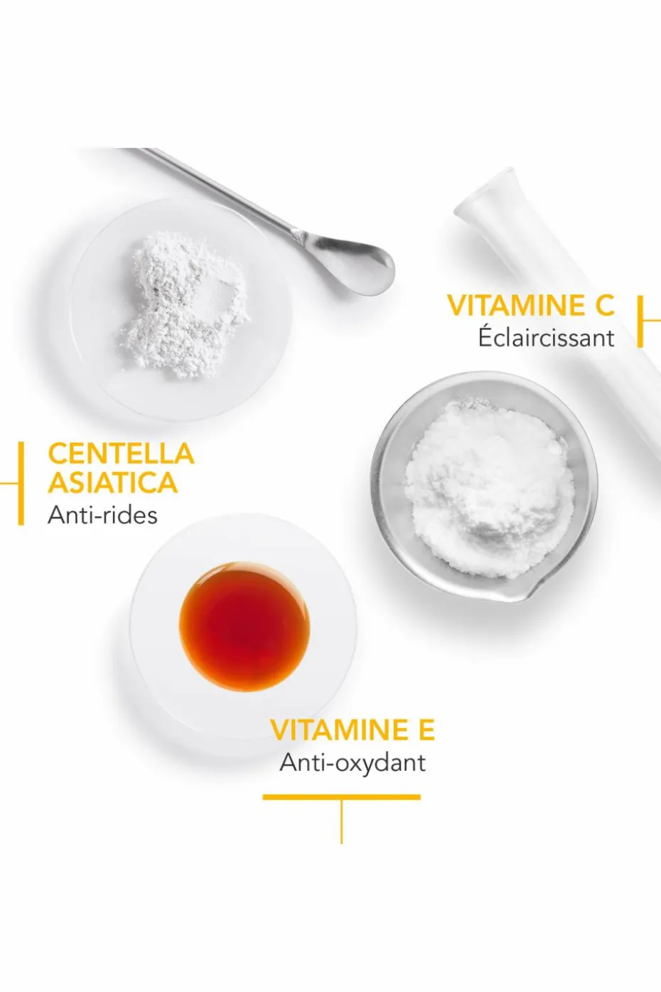 La vitamine E et la vitamine C* hautement stable offrent une protection antioxydante complémentaire contre le spectre solaire total et la pollution, et aident à prévenir l’apparition de nouvelles taches. La vitamine C* et la Centella asiatica stimulent la synthèse de collagène.