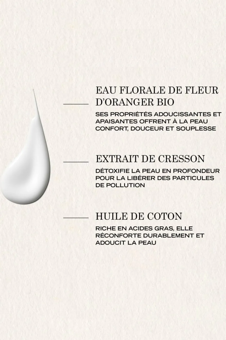 Sa formule composée de 97% d’ingrédients d’origine naturelle, enrichie d’un extrait de cresson connu pour ses propriétés détoxifiantes, libère la peau des particules de pollution et réconforte les peaux délicates.