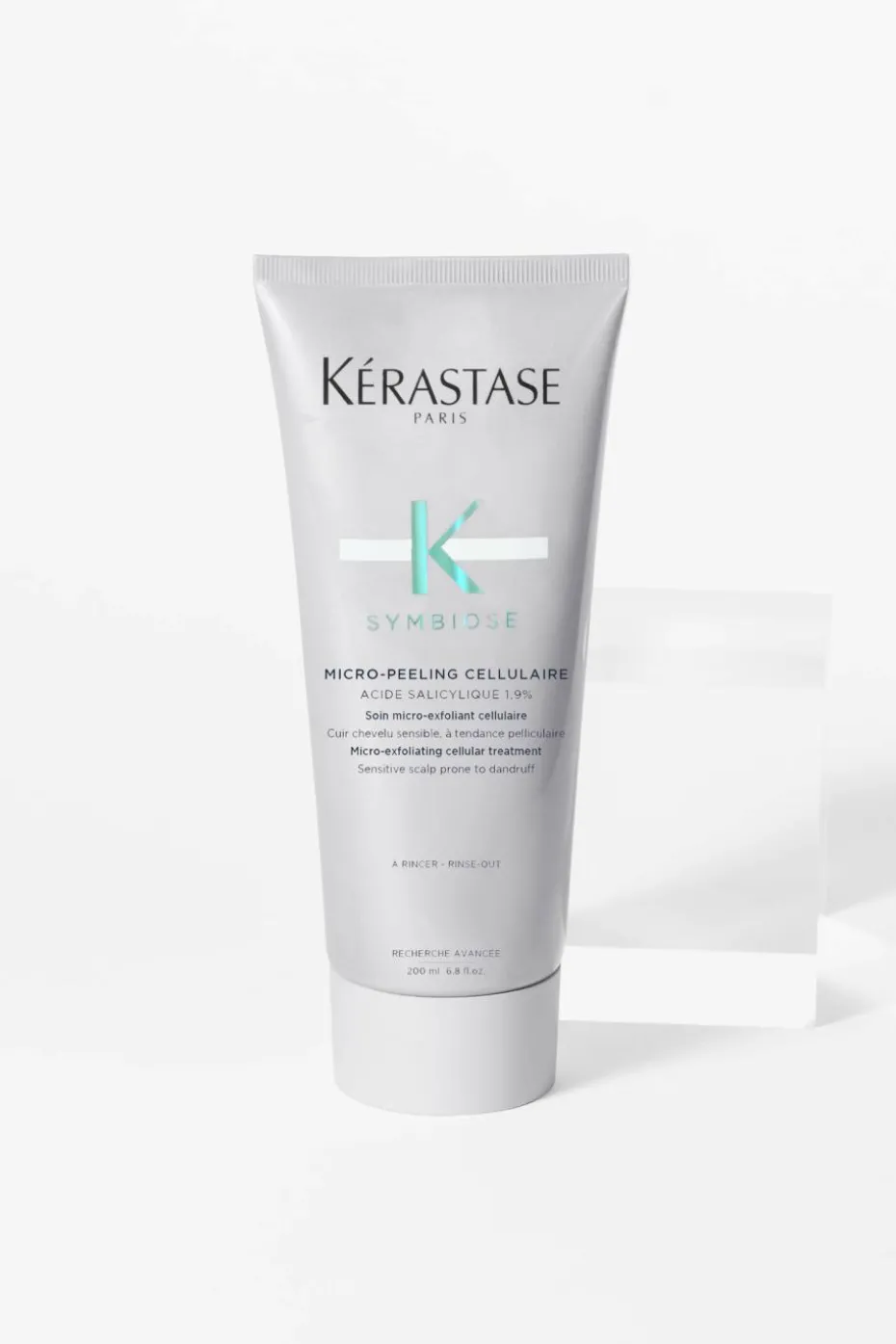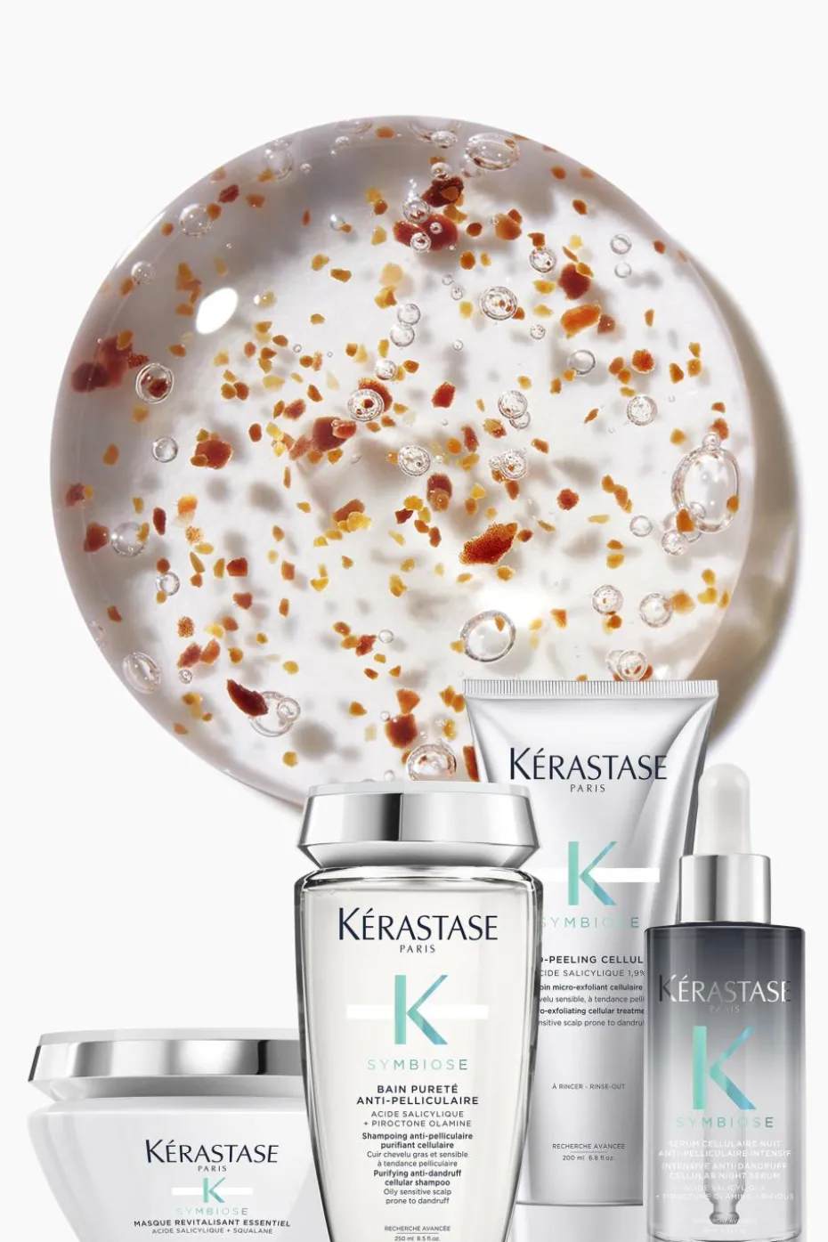 Le Micro-Peeling Cellulaire Symbiose de Kérastase est un soin destiné aux cuirs chevelus sensibles à tendance pelliculaire. Sa formule purifiante sans silicone et sans sulfate offre une double exfoliation instantanée, en ciblant les cellules mortes. L’acide salicylique, associé à l’action de peeling des billets d’argan et d’abricot, élimine durablement les pellicules présentes sur votre cuir chevelu. Celui-ci est purifié sans être agressé. Utilisé avec l’un des deux bains Symbiose et le Sérum Cellulaire Nuit Anti-Pelliculaire Intensif, l’efficacité anti-pelliculaire est cliniquement prouvée jusqu’à 7 semaines*. La routine complète Symbiose permet d’éliminer les pellicules des racines aux pointes. 97% des consommateurs disent observer une disparition des pellicules visibles et 91% se disent satisfaits de l’efficacité du Micro-Peeling Cellulaire**