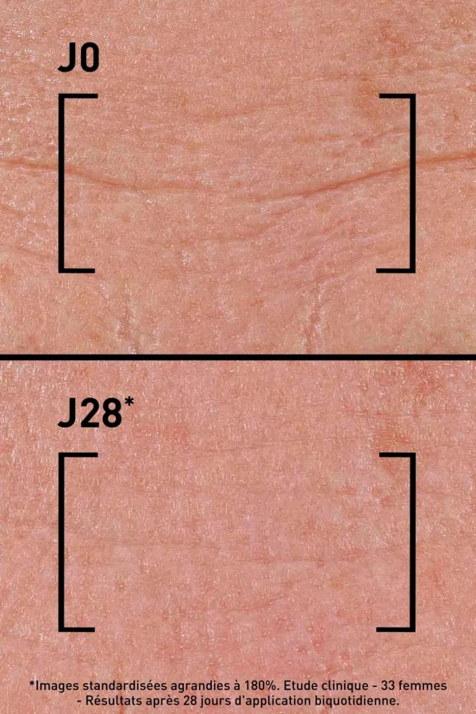– Dès la première application, 97% des femmes déclarent que le produit possède un effet défroissant immédiat et que la peau apparaît plus lisse. Après 7 jours d’utilisation, 94% attestent que le produit semble décrisper les traits. Après 28 jours, 82% observent que leurs rides sont moins creusées*.