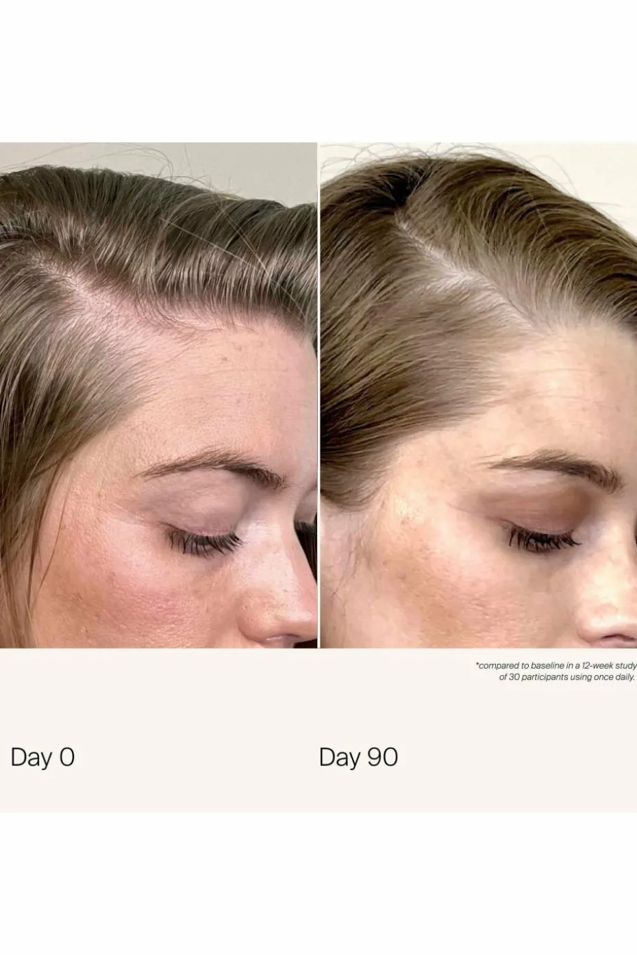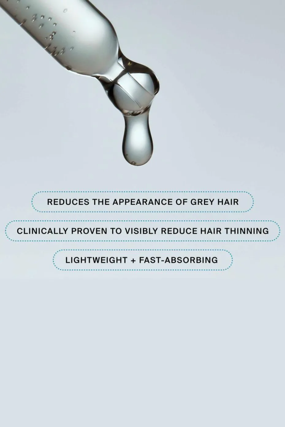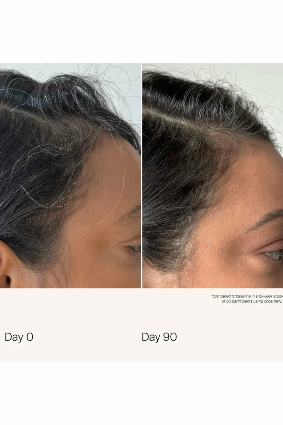 Un sérum capillaire léger et à absorption rapide, formulé pour réduire visiblement l’apparence des cheveux gris, limiter la chute, augmenter la densité capillaire et favoriser une pousse de cheveux plus saine, avec des résultats cliniquement prouvés en seulement 90 jours*.