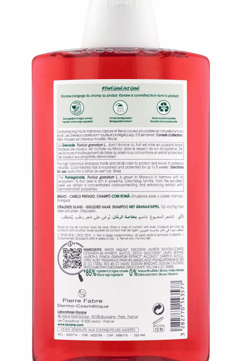 Vegan**** et sensoriel, ce Shampoing haute tolérance est enrichi d’extrait d’écorces de Grenade, véritable protecteur de couleur***.