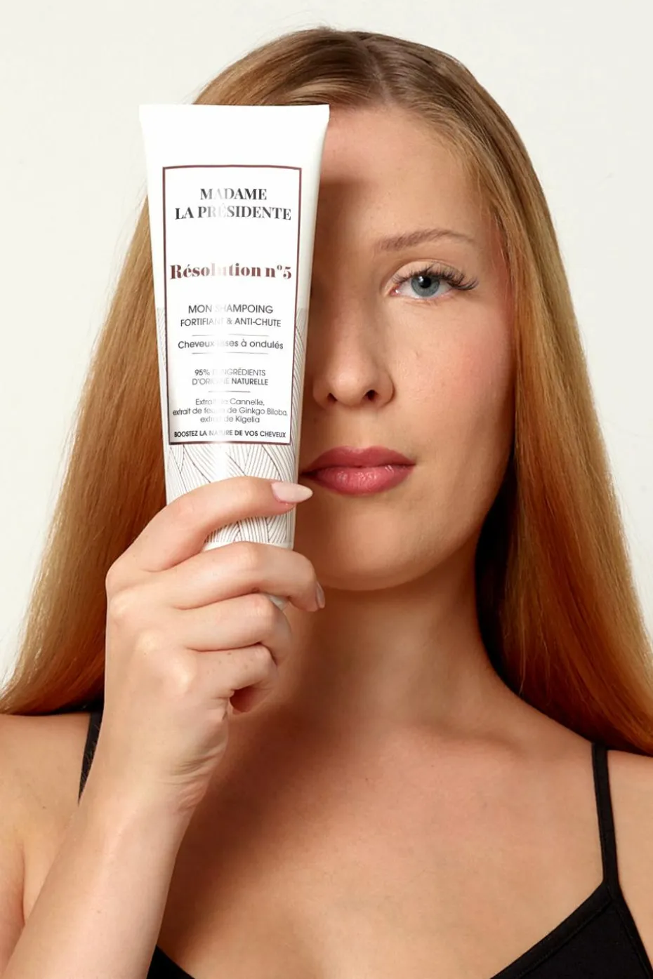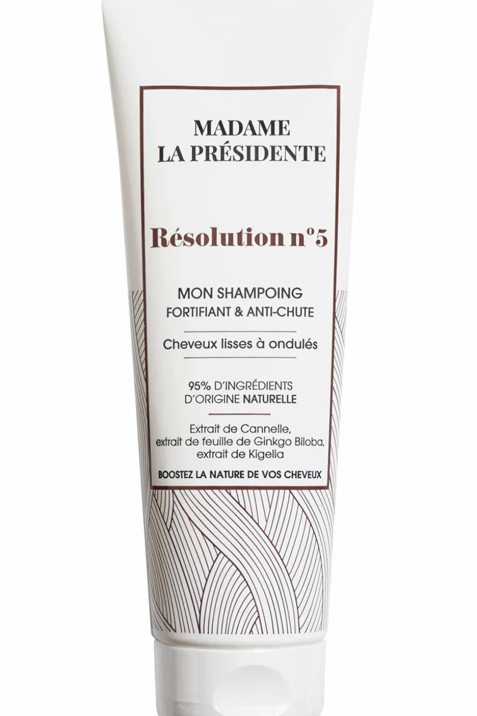 Grâce à sa composition, Résolution n°5 Mon shampoing fortifiant et anti-chute de Madame la Présidente : ralentit la chute, fortifie le bulbe capillaire, stimule la croissance, apporte de la brillance et rend les cheveux doux.