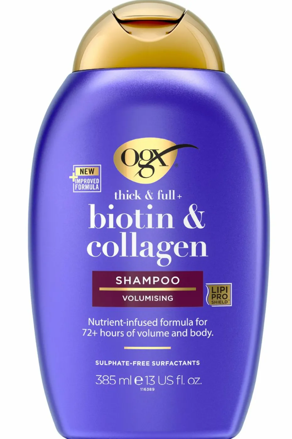 Aqua/Water/Eau, Sodium C14-16 Olefin Sulfonate, Cocamidopropyl Hydroxysultaine, PPG-2 Hydroxyethyl Coco/Isotearamide, Sodium Chloride, Biotin, Hydrolyzed Collagen, Hydrolyzed Wheat Protein, Ethyltrimonium Chloride Methacrylate/Hydrolyzed, Wheat Protein Copolymer, Amodimethicone, Dimethicone, Cocamidopropyl Betaine, PEG-120 Methyl Glucose Dioleate, Guar Hydroxypropyltrimonium Chloride, Glycol Distearate, Polyquaternium-6, Polyquaternium-10, Laureth-4, Laureth-23, Cetrimonium Chloride, Trideceth-12, Sorbitan Laurate, Sodium Hydroxide, Propylene Glycol, Disodium EDTA, Citric Acid, Tetrasodium EDTA, Diazolidinyl Urea, Iodopropynyl Butylcarbamate, Parfum/Fragrance, Hexyl Cinnamal, Benzyl Benzoate, CI 60730/Ext. Violet 2, CI 16035/red40, CI 19140/Yellow5