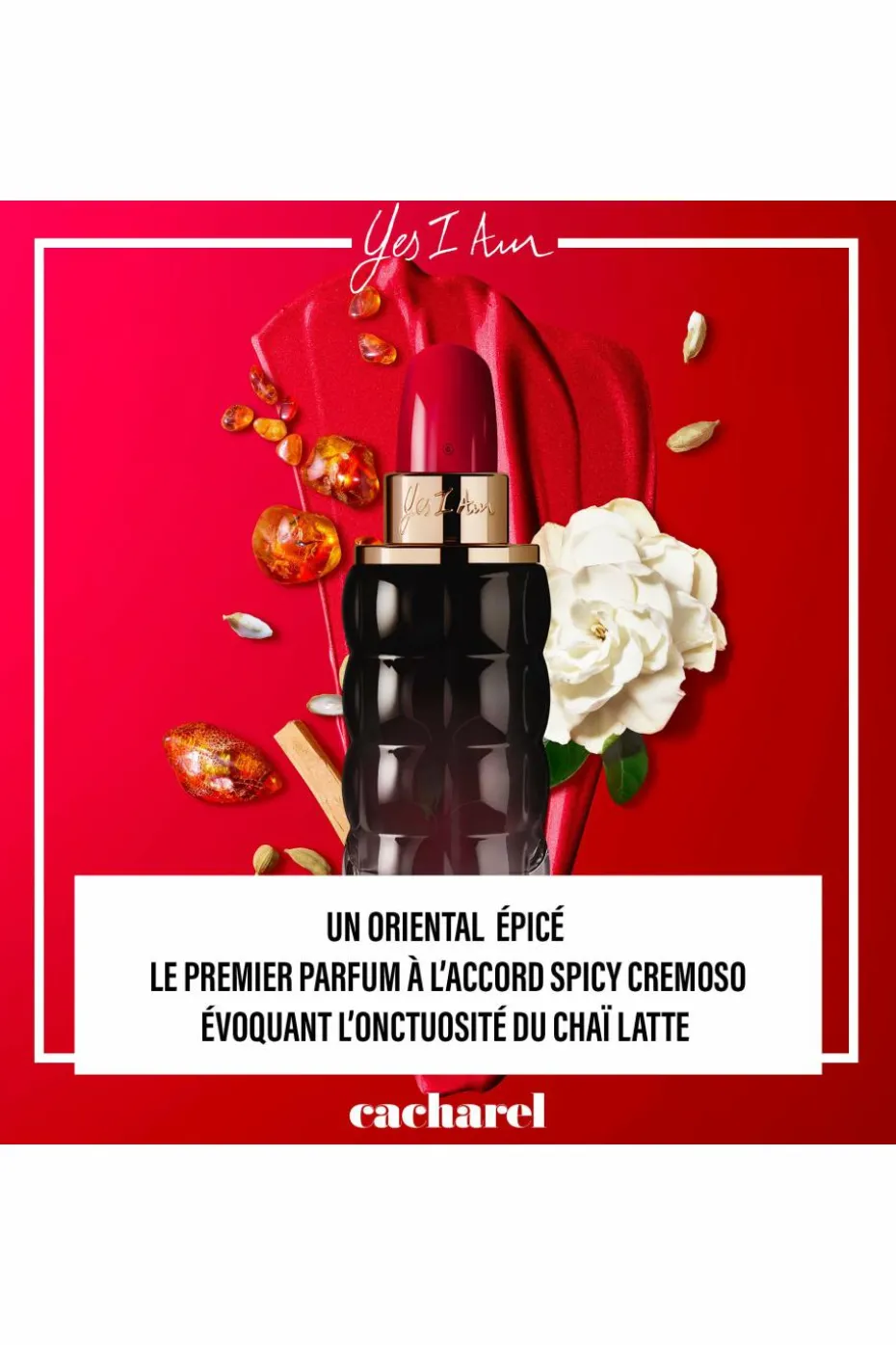 L’Olfaction : Rouge à lèvres et parfums ont tous deux le pouvoir de changer la façon dont vous vous placez dans le monde. L’écriture olfactive de YES I AM est donc pensée comme les qualités du rOuge à lèvre idéal : Les notes de tête apportent de l’éclat : Le côté juteux et délicieux de la framboise est délicieusement relevé par l’effervescence zestée de la mandarine qui apporte dynamisme et vivacité. Les notes de cœur apportent de la texture : Le bouquet de fleurs blanches enveloppe la fragrance de notes voluptueuses et raffinées. Le jasmin Sambac et le gardénia développent une floralité poudrée et opulente. La fleur de gingembre, plus osée, ajoute des facettes douces, exotiques et légèrement épicées. L’ambre vient texturiser ce bouquet de notes douces, chaudes et vanillées. Les notes de fond apportent de la tenue : Un accord « spicy cremoso » inédit inspiré du Chai Latte : le lait se pare des tonalités épicées de la cardamome et s’associe au santal pour créer un cocon crémeux. Yes I Am est la première eau de parfum basée sur ce contraste crémeux-épicé.